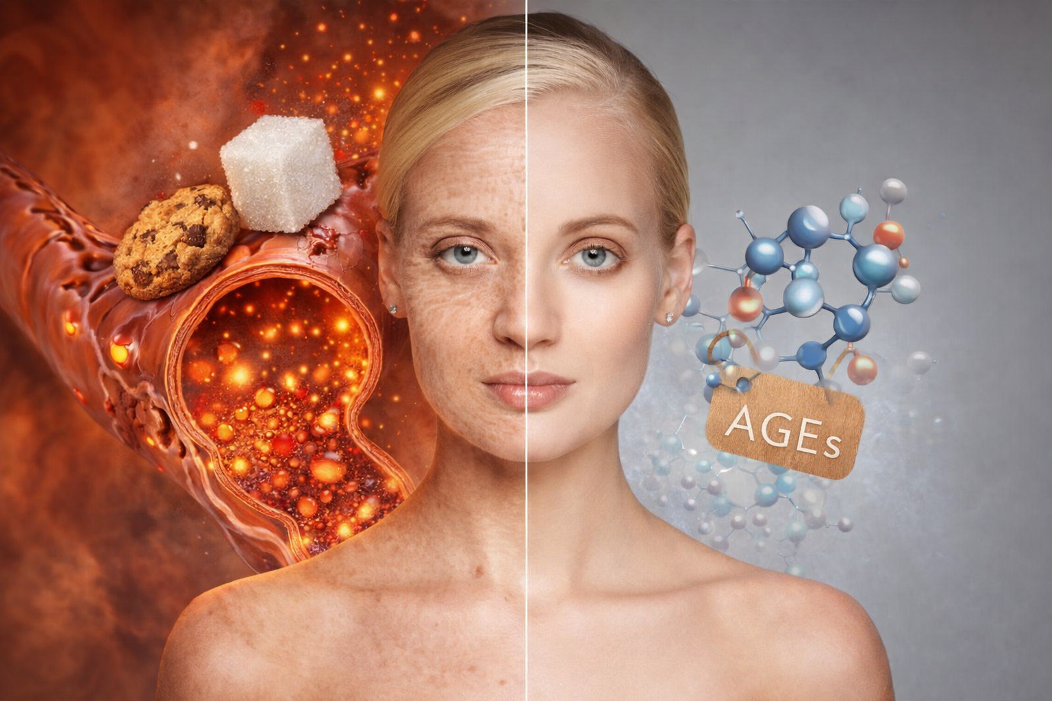 Wanneer er te veel suiker in je bloed zit, kunnen suikermoleculen zich binden aan eiwitten. Dit proces heet glycatie. De gevormde AGE’s hebben een schadelijk effect op belangrijke structuren in je lichaam, waaronder collageen.